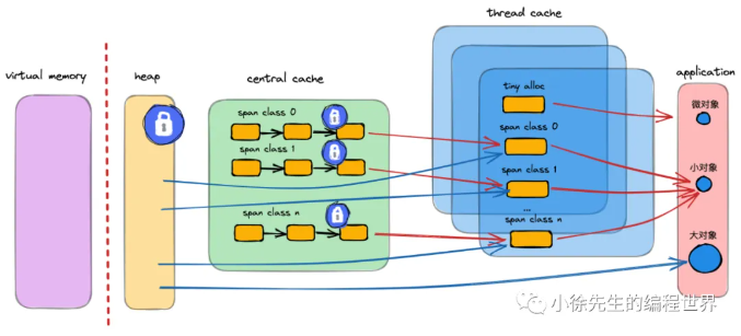 堆是 Go 运行时中最大的临界共享资源,这意味着每次存取都要加锁,在性能层面是一件很可怕的事情,每次都加锁获取,性能严重降低