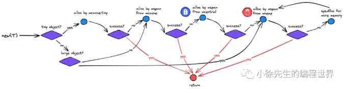 下面来串联 Golang 中分配对象的流程,不论是以下哪种方式,最终都会殊途同归步入 mallocgc 方法中,并且根据 3.1 小节中的策略执行分配流程: