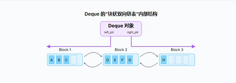 - 头尾指针: Deque 对象本身持有指向最左边块(头部)和最右边块(尾部)的指针,以及块内具体元素的偏移量。