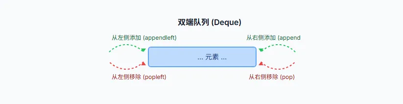 你可以把它想象成一个"两头通"的桥,人们既可以从队头加入/离开,也可以从队尾加入/离开。这种灵活性使得 Deque 成为一种非常强大的数据结构,可以同时高效地实现队列和栈的操作。