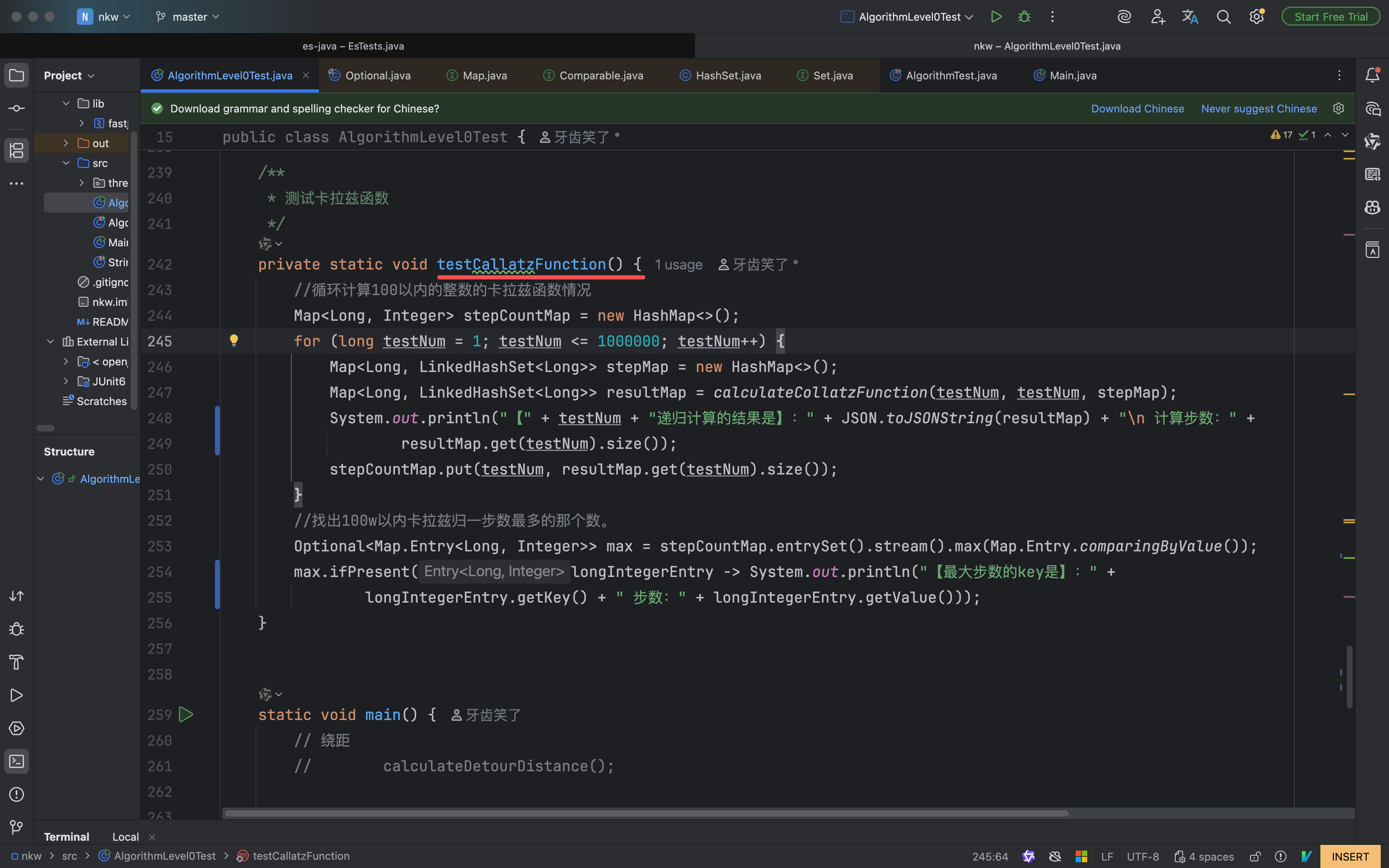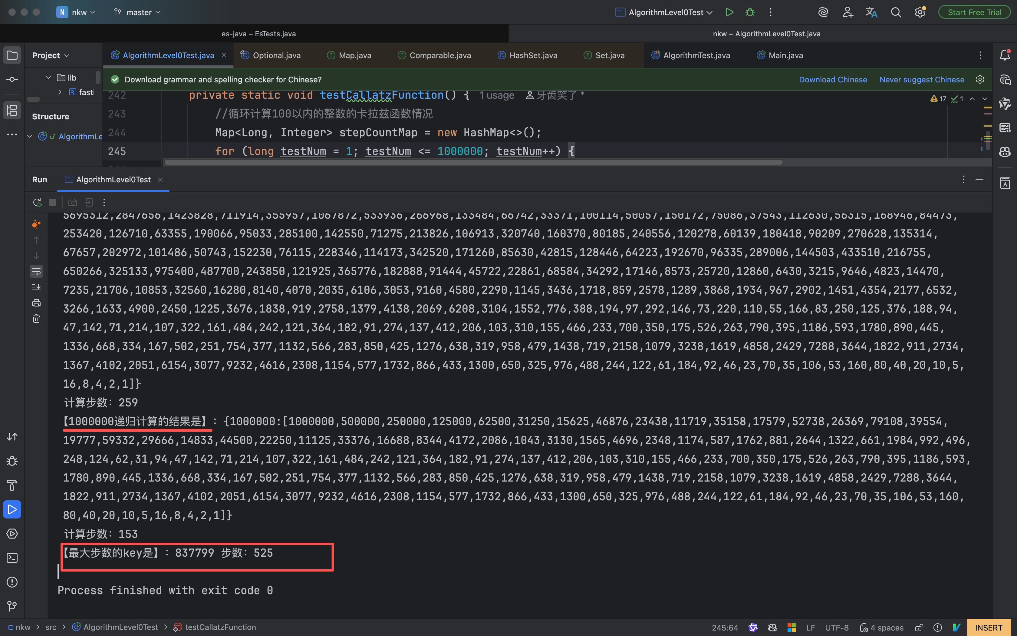 这个函数定义很简单,但是至今没人能穷尽证明;而且有些看似简单的数计算步骤却很多。我们目的是自己按照定义用java写一下,计算100、10w、100w以内的整数的归一情况,并找出100w以内归一步数最大的那个数和步数。
