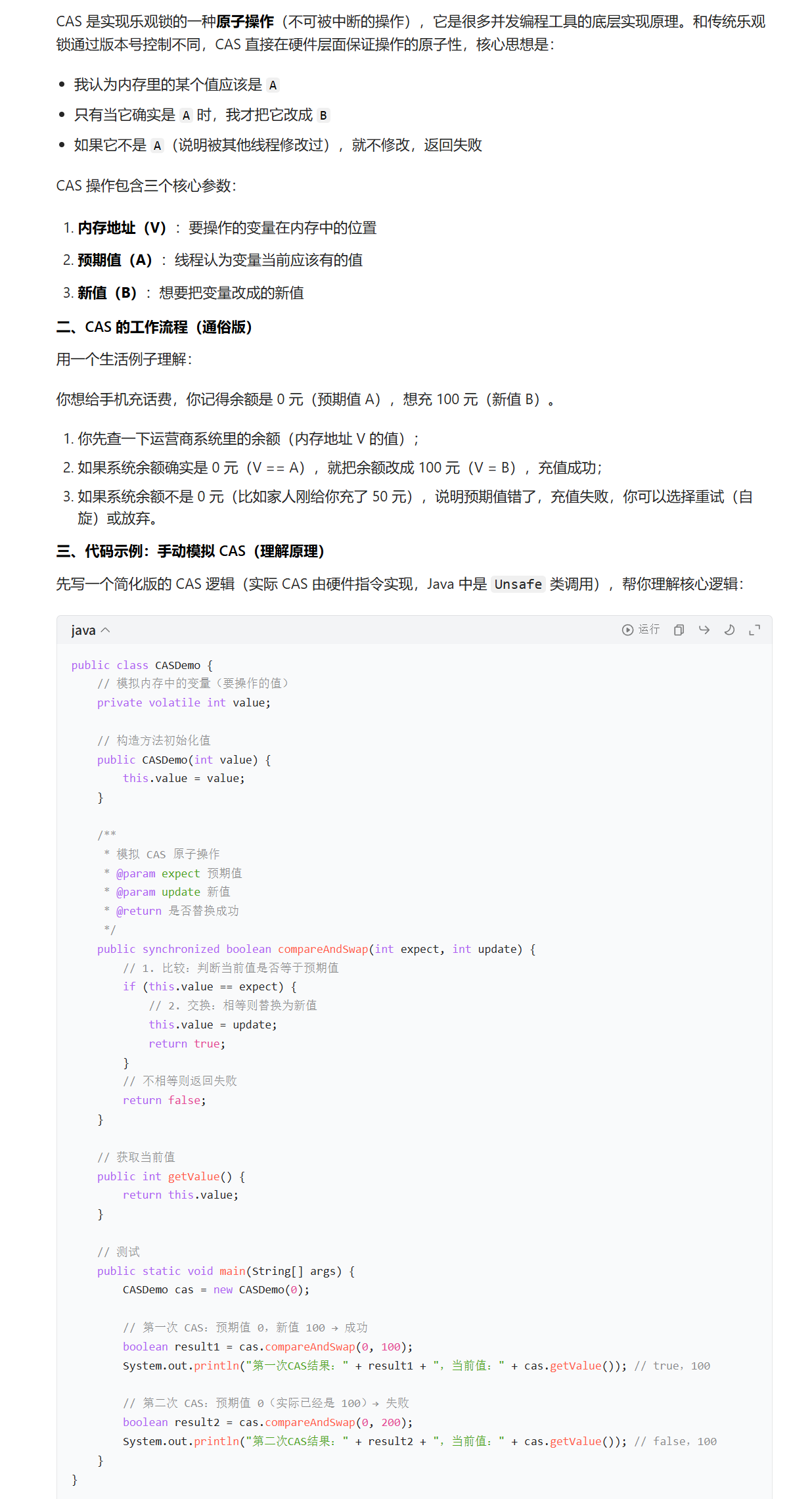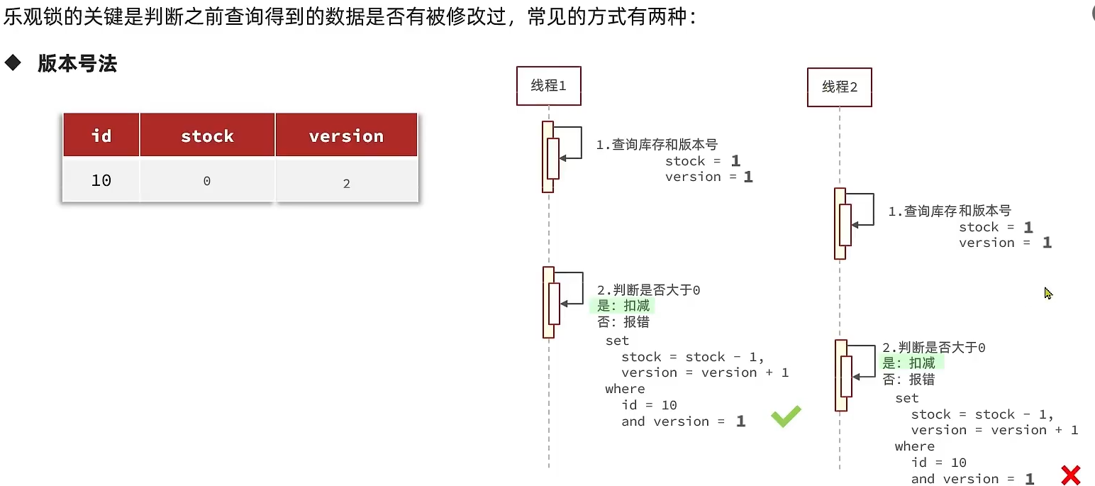 课程中的使用方式是没有像cas一样带自旋的操作,也没有对version的版本号+1 ,他的操作逻辑是在操作时,对版本号进行+1 操作,然后要求version 如果是1 的情况下,才能操作,那么第一个线程在操作后,数据库中的version变成了2,但是他自己满足version=1 ,所以没有问题,此时线程2执行,线程2 最后也需要加上条件version =1 ,但是现在由于线程1已经操作过了,所以线程2,操作时就不满足version=1 的条件了,所以线程2无法执行成功