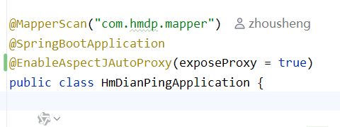 还要在启动类上面加一个注解去暴露动态代理,默认是不暴露的,加上这个就可以获得IVoucherOrderService代理对象。