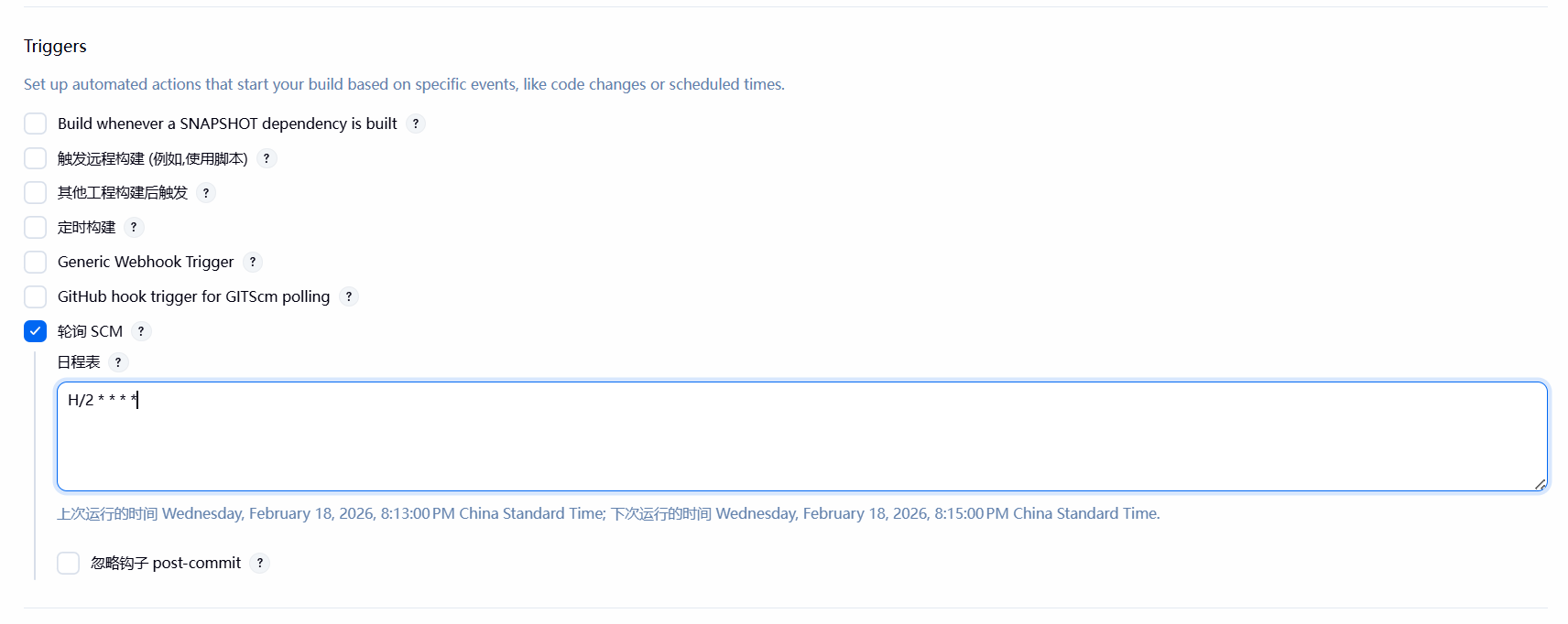 SCM(Source Code Management,源码管理),轮询 SCM,就是定时去查看源码仓库,当源码仓库有变化时触发构建。
