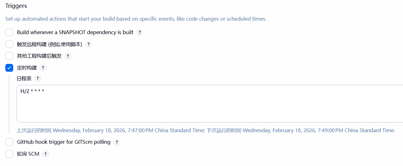 加了 H 表示 Jenkins 会自己找一个合适的时间开始,往后每两分钟执行一次。