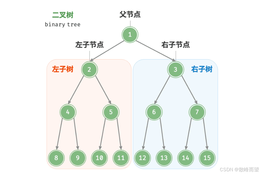每个节点都至多只有 2 个引用(指针),分别指向左子节点和右子节点,该节点被称为这两个子节点的父节点。当给定一个二叉树的节点时,我们将该节点的左子节点及其以下节点形成的树称为该节点的左子树,同理可得右子树。