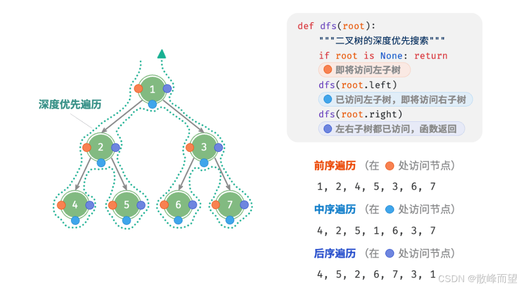 不同于常规树的深度优先遍历,二叉树因其独特的性质可以划分成三种深度优先遍历:先序遍历,中序遍历,和后序遍历。其中,三种遍历方式的不同在于处理根节点的时机。