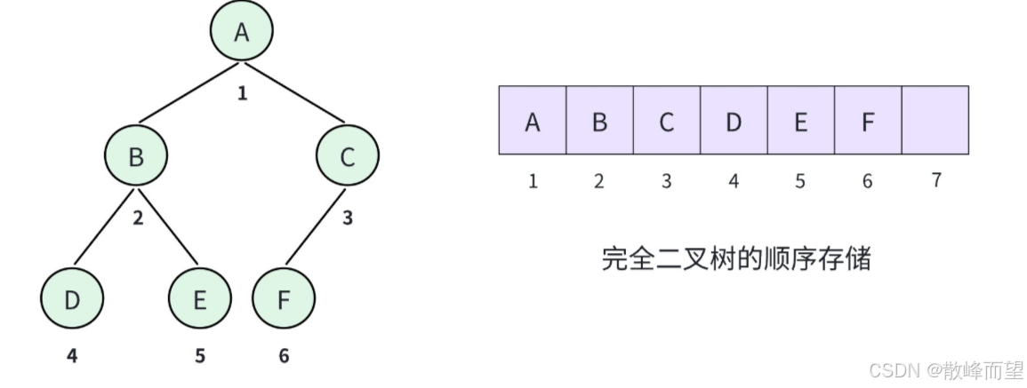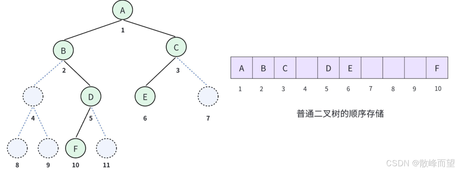 可以看到我们的二叉树其实只有 6 个节点,但是顺序存储却要分配 10 个空间,其中有 4 个空间都被浪费掉了。