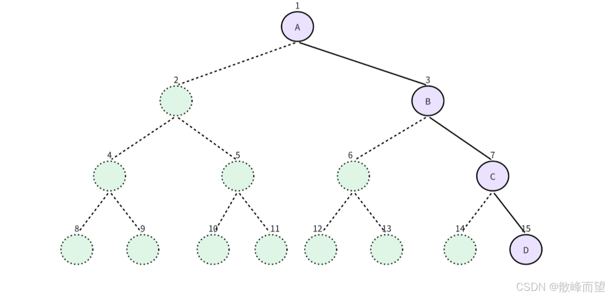 在完全二叉树以及满二叉树的性质那里,我们了解到:如果从根节点出发,按照层序遍历的顺序,由 1 开始编号,那么父子之间的编号是可以计算出来的。那么在存储完全二叉树的时候,就按照编号,依次放在数组对应下标的位置上,然后通过计算找到左右孩子和父亲: