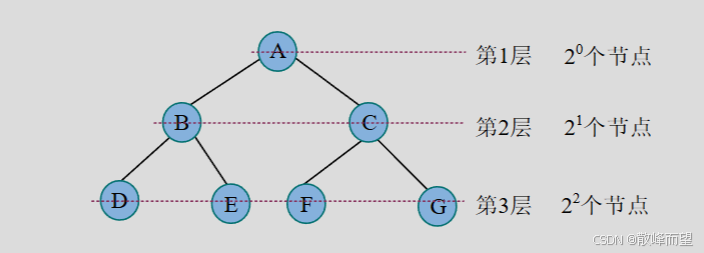 第 2 层最多为 2 个节点,第 3 层最多有 4 个节点,因为上一层的每个节点最多有 2 个孩子,因