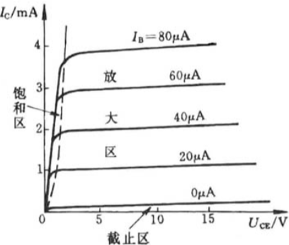 时三极管处于饱和状态,这也是我们最常用的状态,此时三极管被完全打开,IC 的则完全取决于供给端的电流,不在做限流。