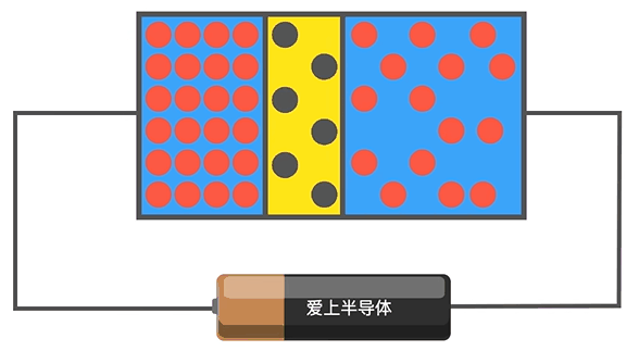 如果我们向 P 极半导体通电,填满空穴,整块半导体则是一个导体,同时我们给 P 极的电流也会流向发射极: