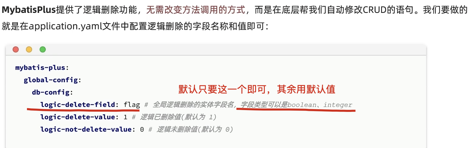 配置后,MP 会自动在所有 SQL 中加上逻辑删除条件,无需手动处理。