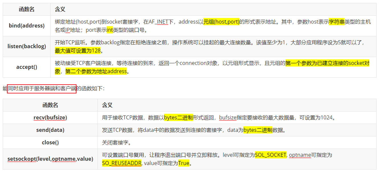 当有了socket对象后,常用于服务器端的函数如下: