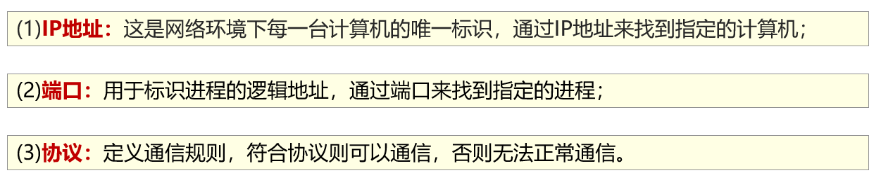 要使用编程语言实现多台计算机的网络通信,需要具备网络编程三个要素: