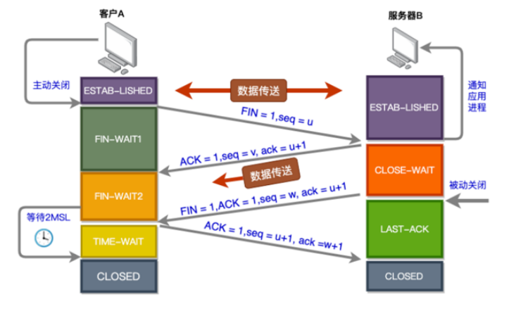 - 第四次挥手: 主机A对主机B的请求进行确认,双方向的关闭结束