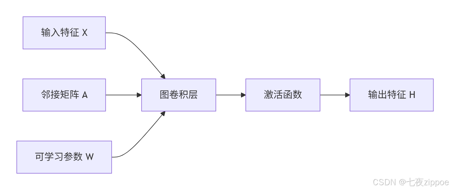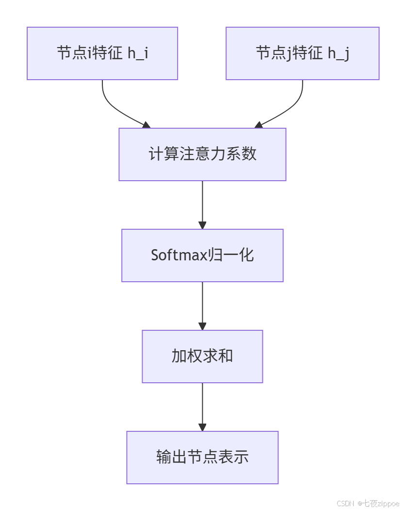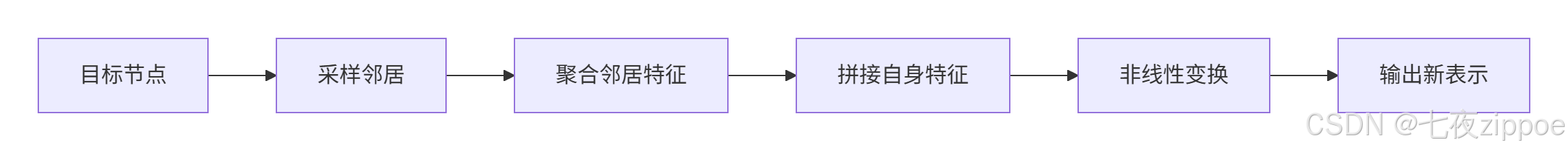 白话解释:每个节点收集邻居的信息,加权平均后通过神经网络变换,得到新的表示。