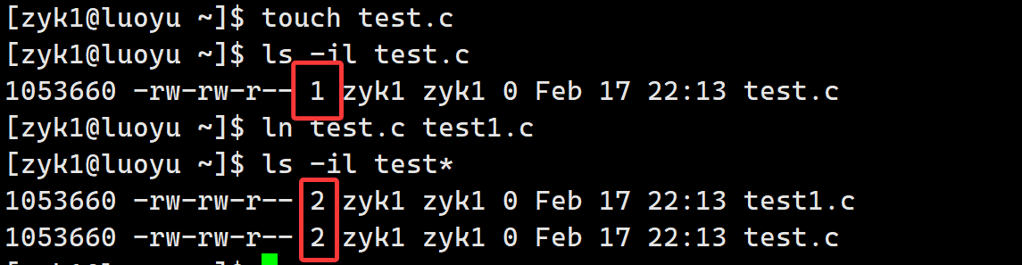 在ls显示文件详细属性这里,这一列数字就表示这个文件有几个硬链接,内核记录了这个硬链接数。当删除一个文件时,首先会将硬链接数-1,只有当为0时才会真正删除内容: