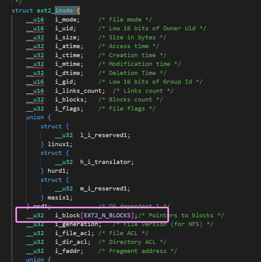 在inode结构中,有一个数组i_block,里面记录这个文件的内容存放在哪些块的块号,所以文件就可以通过它的inode寻找到它的内容了。