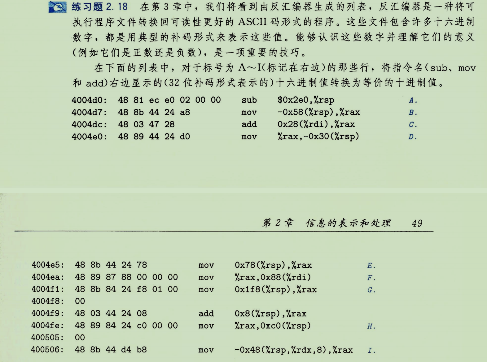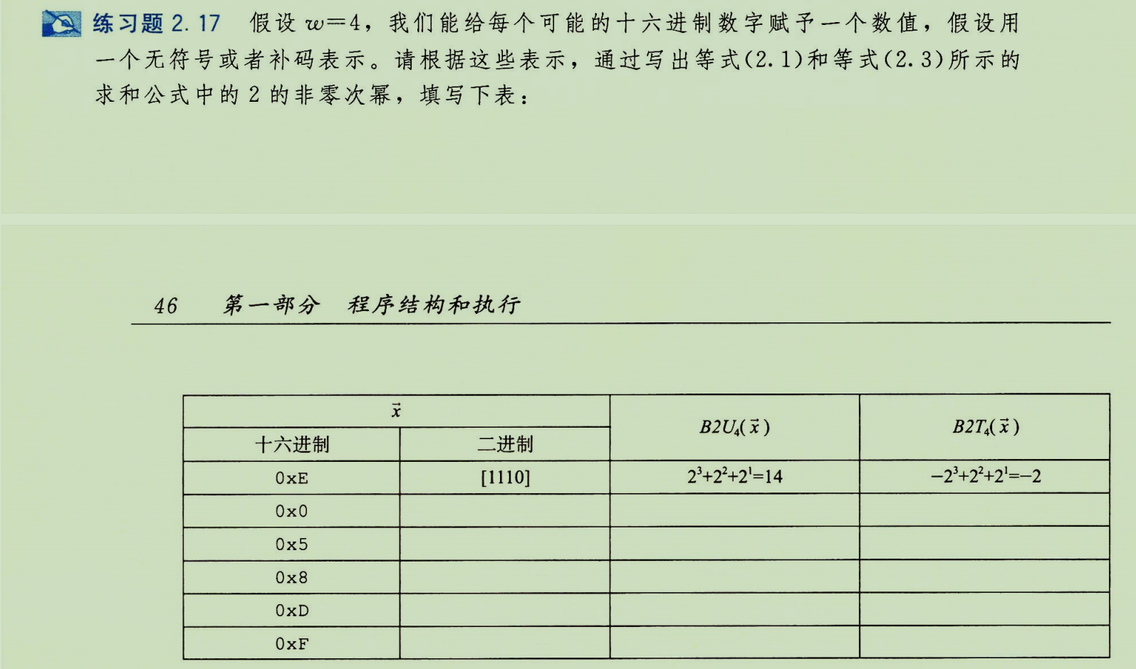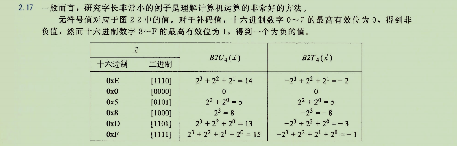 练习将十六进制数字解释为无符号数和补码数,并手动计算其十进制值。核心是理解同一串位,在不同解释(上下文)下,值不同。