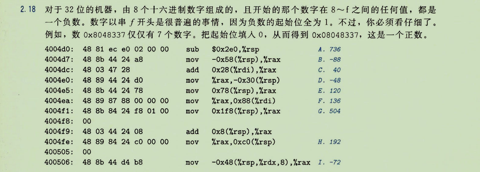 进一步练习根据补码编码公式 B 2 T w B2T_w B2Tw,将十六进制机器代码值转换为程序员可读的十进制值。这是理解机器级代码的基础。