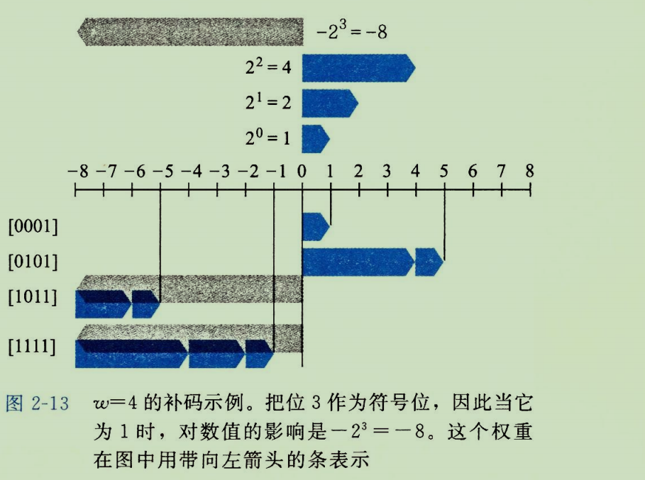 对于位向量 x ⃗ = [ x w − 1 , x w − 2 , . . . , x 0 ] \vec{x}=[x_{w−1},x_{w−2},...,x_0] x =[xw−1,xw−2,...,x0],其表示的补码值为: B 2 T w ( x ⃗ ) ≐ − x w − 1 ⋅ 2 w − 1 + i = ∑ i = 0 w − 2 x i ⋅ 2 i B2T_w (\vec{x})\doteq−x_{w−1} \cdot2^{w−1}+i=\sum_{i=0}^{w-2} x_{i} \cdot2i B2Tw(x )≐−xw−1⋅2w−1+i=i=0∑w−2xi⋅2i