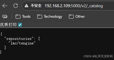 再次访问 http://192.168.2.109:5000/v2/_catalog,这回能看到仓库列表里已经有了 lmc/tengine: