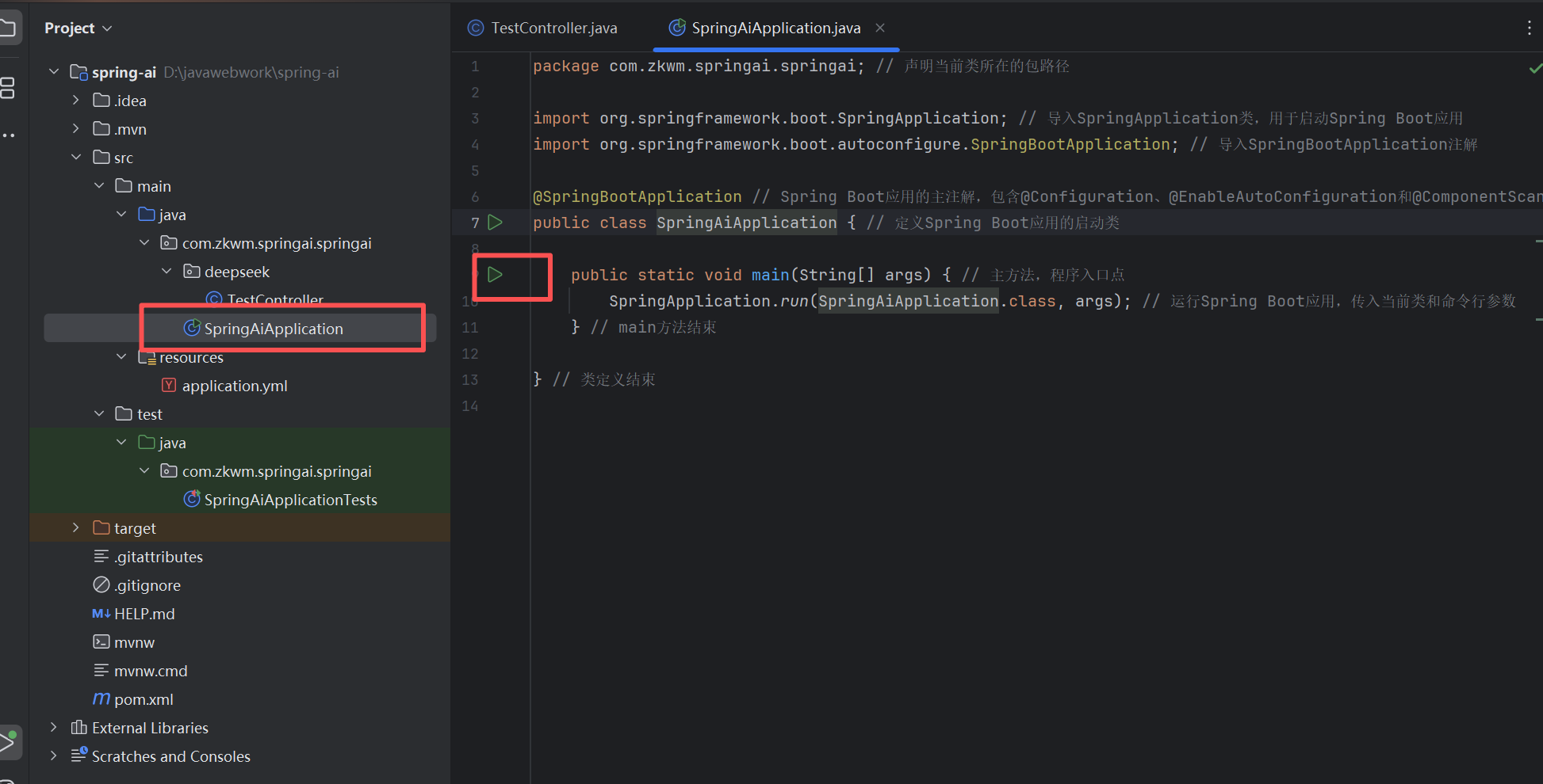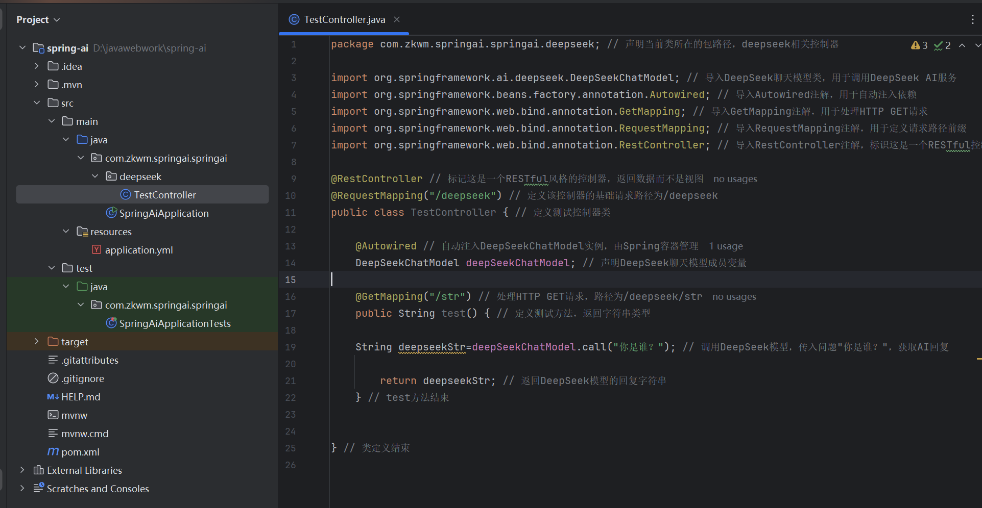 String deepseekStr=deepSeekChatModel.call("你是谁?"); // 调用DeepSeek模型,传入问题"你是谁?",获取AI回复