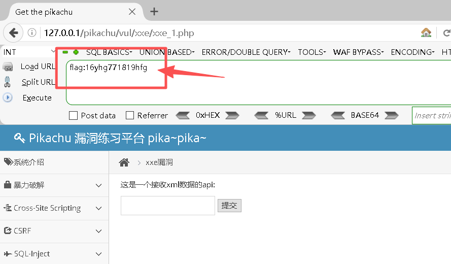 Step5:在目标机的Pikachu的输⼊框输入如下xml。用来读取flag.txt。