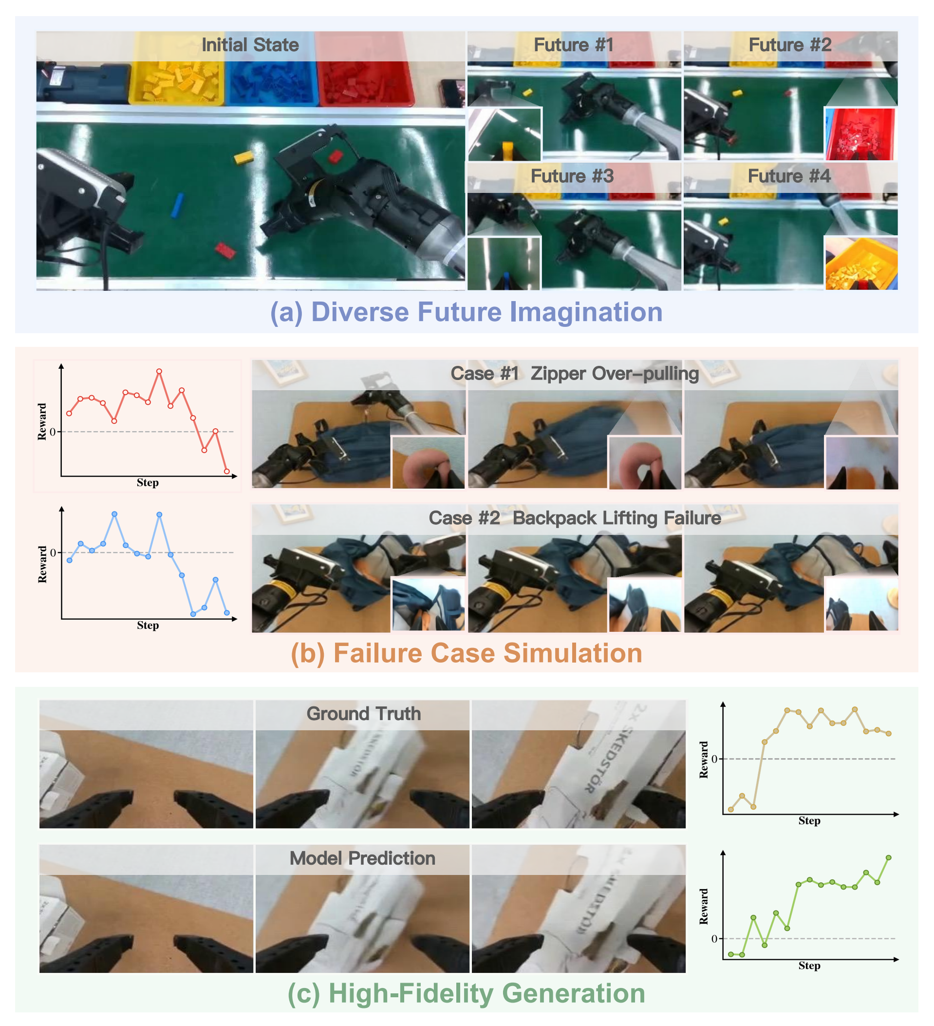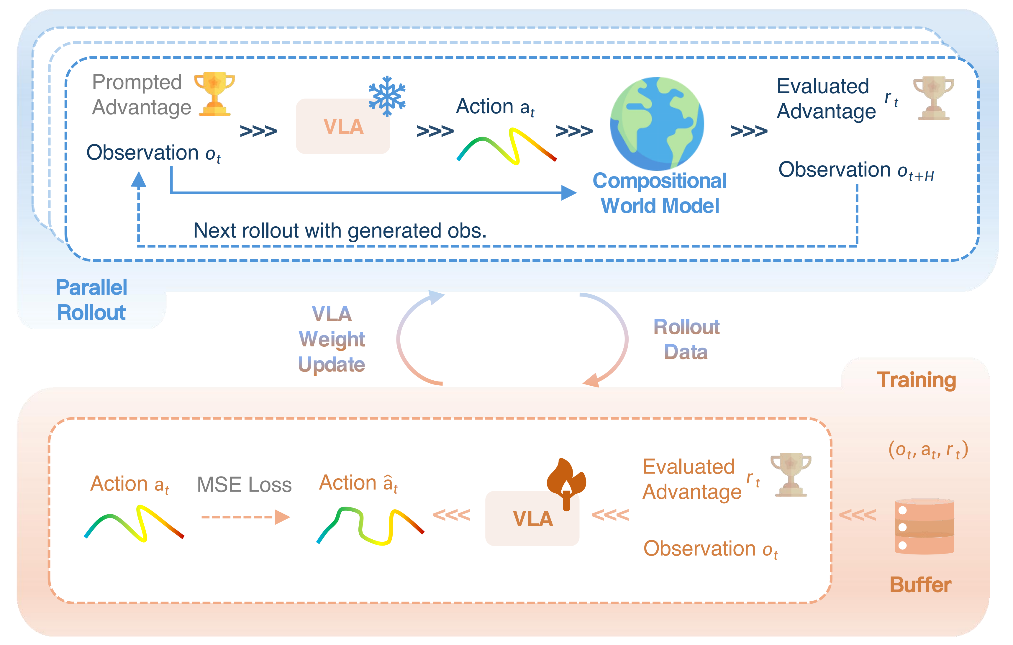 具体而言,其核心思想是通过"想象"来强化机器人基础模型,从而实现自我提升。在该框架的核心,是由一个学习得到的世界模型所实现的在线学习环境
