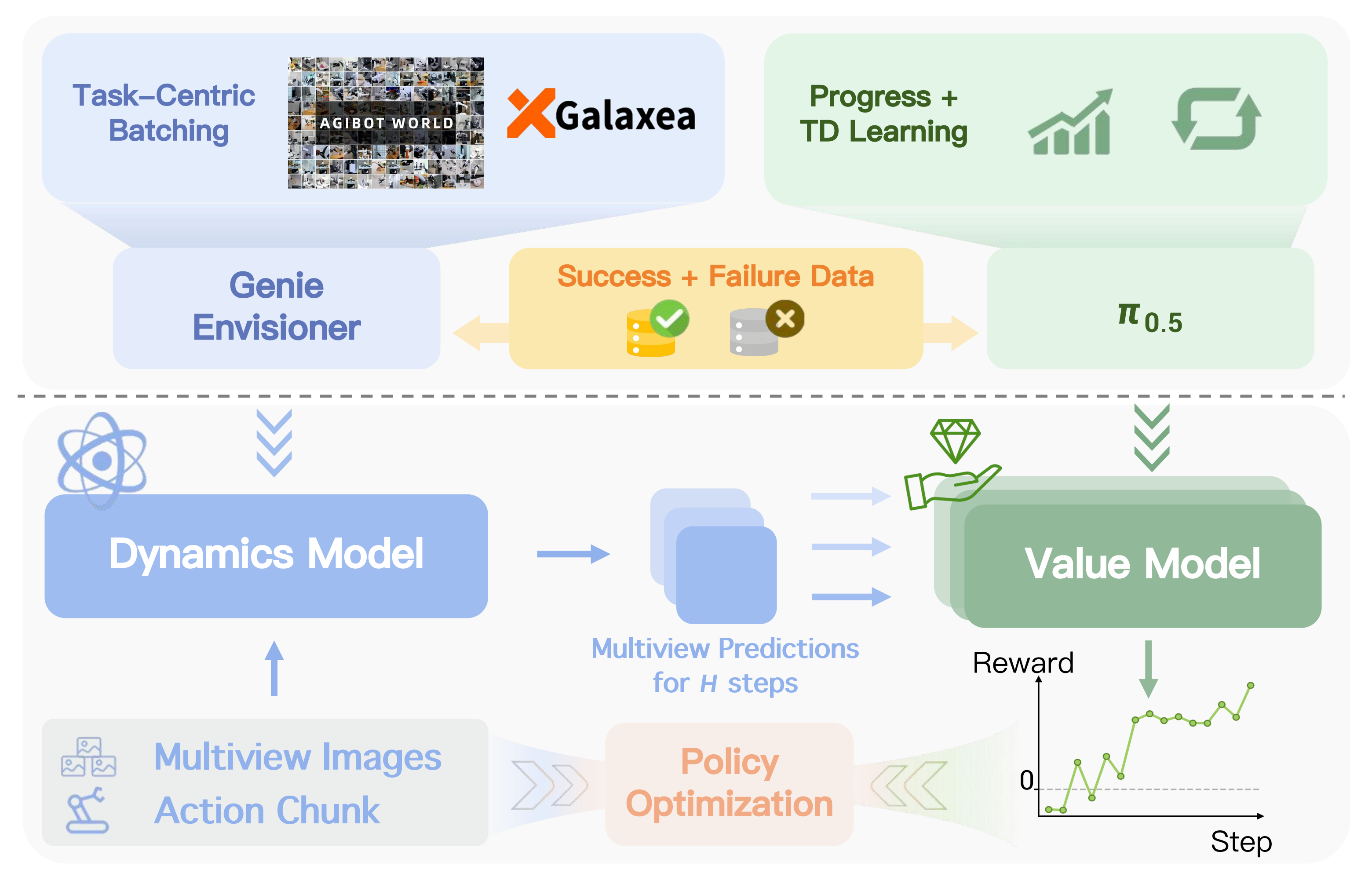 因此,作者学习一个价值估计器V,它将感知到的观测映射为一个用于对想象轨迹进行评分的标量值。V 是从一个预训练的VLA 策略π0.5 [8] 参数化得到的,这带来了两个优势