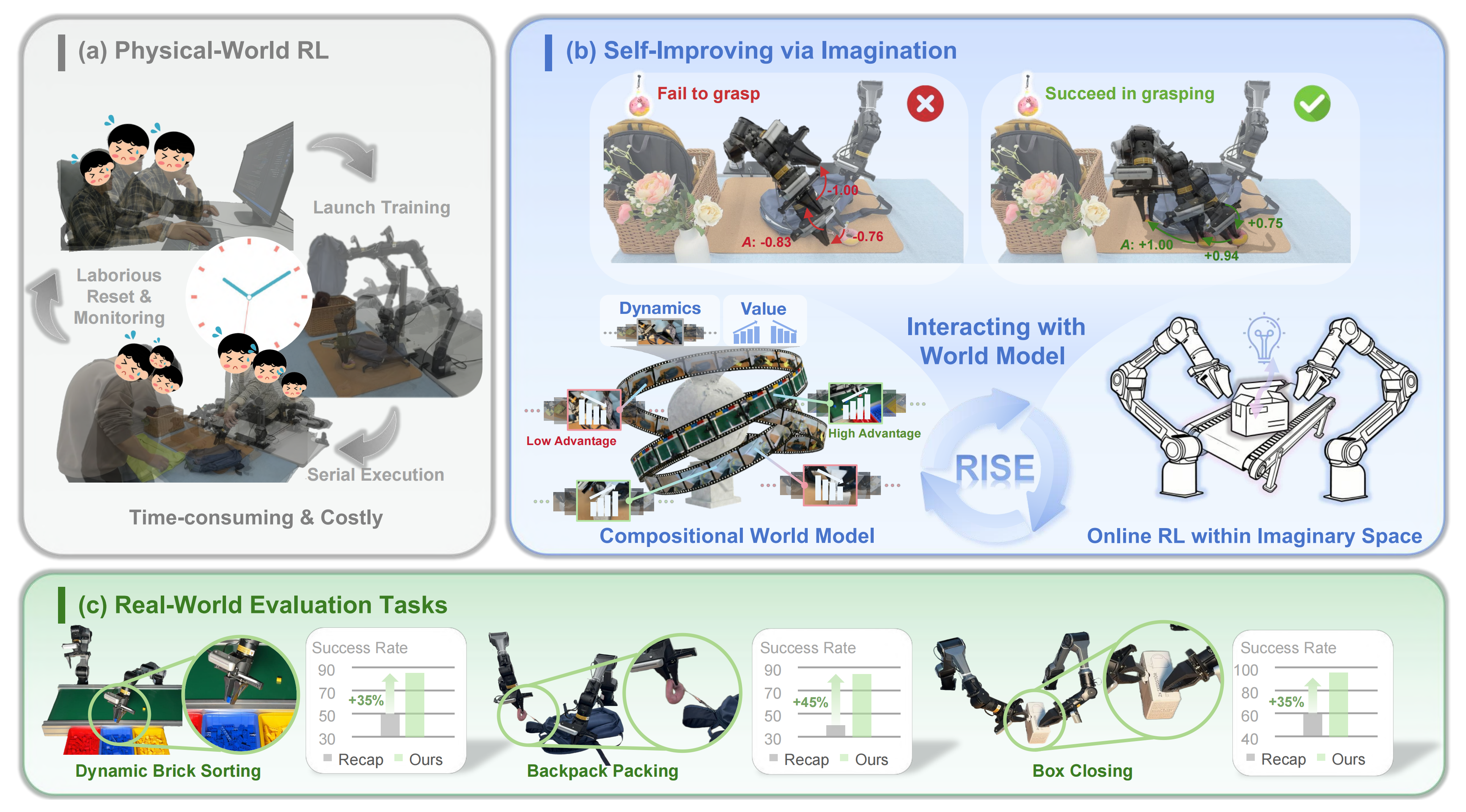 为弥合这一鸿沟,RISE应运而生,一个通过想象进行机器人强化学习的可扩展框架。其核心是一个组合式世界模型,该模型