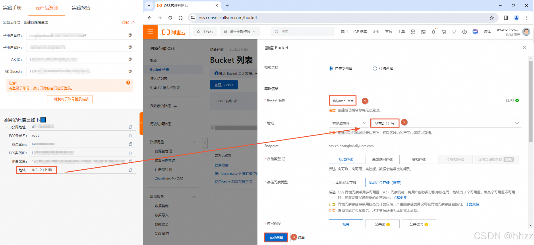 | AccessKeySecret | 配置ossfs时使用 | 通过实验左侧导航栏,点击云产品资源获取,AK Secret即AccessKey Secret |