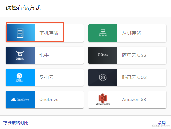 - 在左侧导航栏中,单击存储策略;在存储策略页面,单击添加存储策略;在选择存储方式对话框中,选择本机存储。