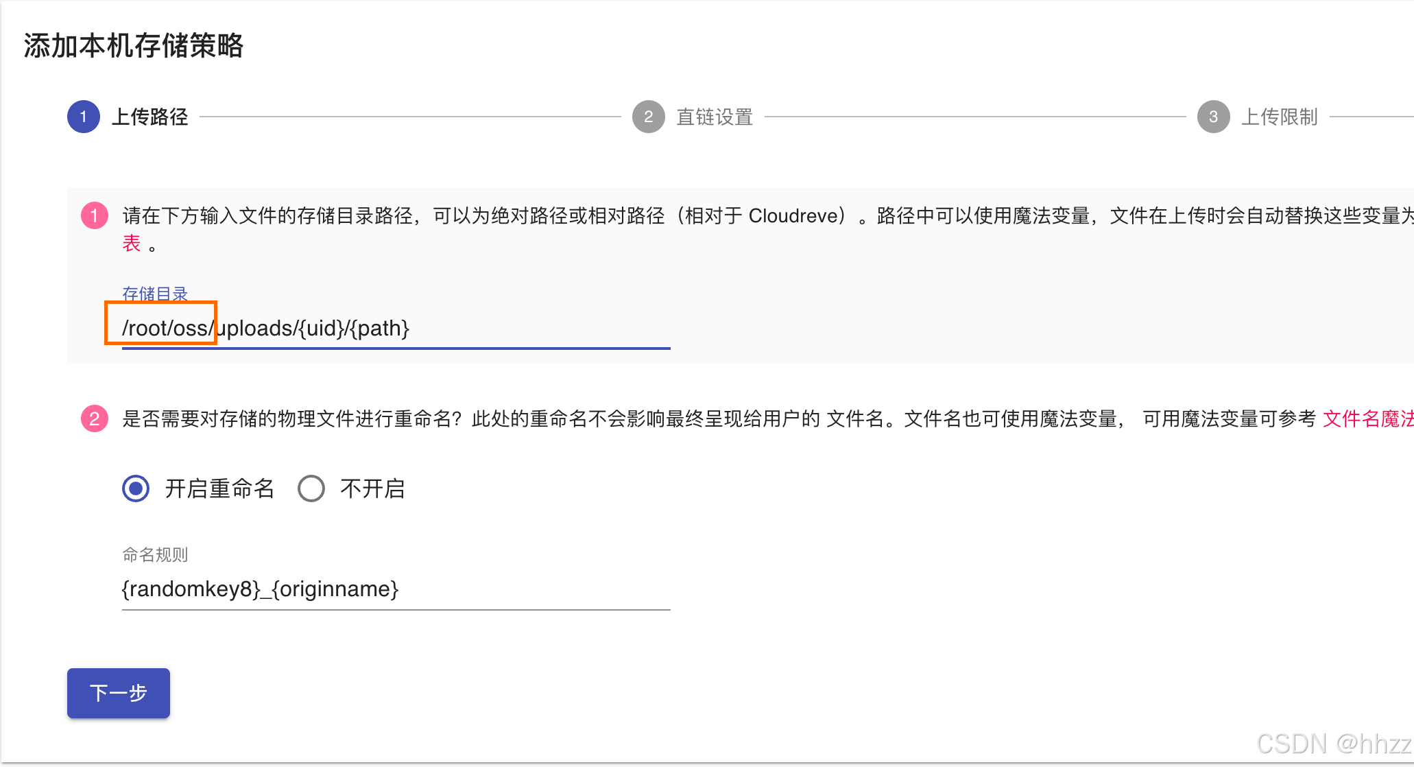 - 在添加本机存储策略的上传路径页面中,将存储目录修改为/root/oss/uploads/{uid}/{path},单击下一步。