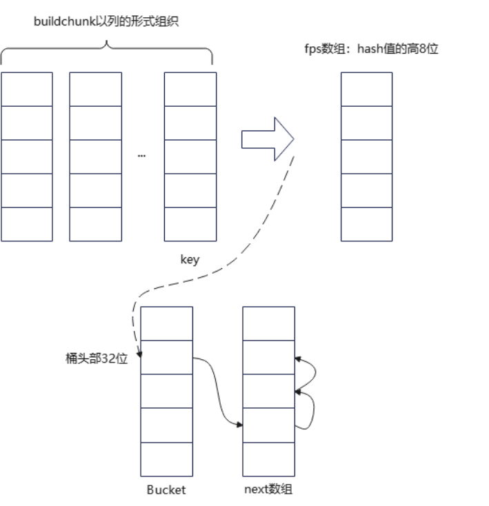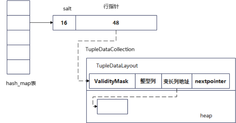 DuckDB同样实现了数据和hash表分离,大体上也是提高内存中hash表的容量,在内存中容纳更多的hash桶。