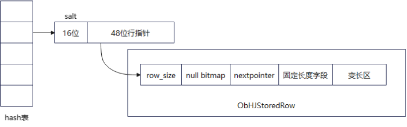 这种做法的缺点:数据和hash表放在一起,相对来说内存中hash表的hash entry数目就会变少,内表的hash表就会提前溢出到磁盘,从而导致外表也跟着溢出磁盘,进而数据IO代价就会变大。另外,数据以行的形式存储,也不利于VectorBatch批量执行和构建join结果,数据的cache miss也会变大。