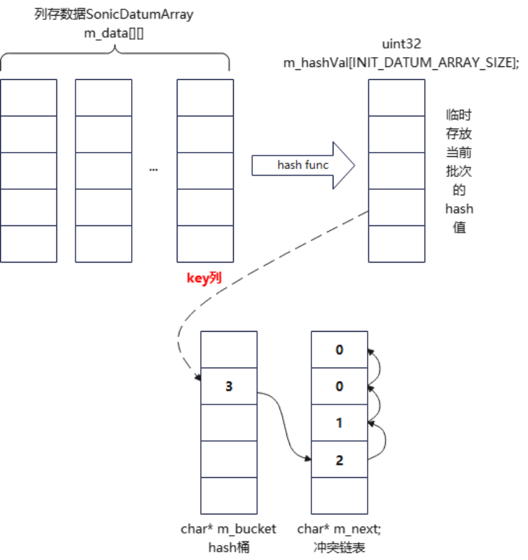 如上图所示,hash表的hash桶是一个一字节大小的m_bucket数组 ,存储链表头也就是m_next的序号 。m_next链表是冲突链表,同一个hash值向链表头部插入,m_next[i]表示第i行下一个冲突值在m_next[]数组中的序号,i值是全局行号,和m_data[][]数组对应,取数据时m_data[1][i]是第1列的第i行值。通过hash值确定桶头后,遍历m_next数组,得到第i行,然后从**m_data[key][i]**取key数据进行key值比较。