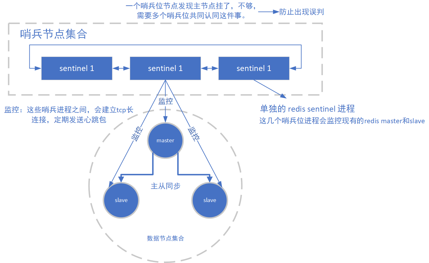 | 哨兵节点 | 监控 Redis 数据节点的节点 | 一个独立的 redis-sentinel 进程 |