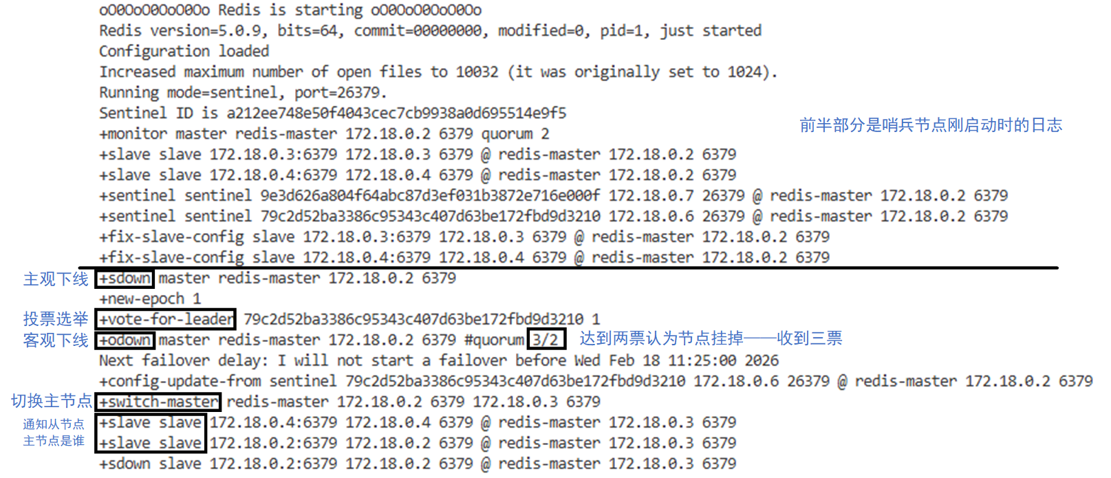 bashredis-sentinel-1 | 1:X 18 Feb 2026 11:18:59.605 # +vote-for-leader 79c2d52ba3386c95343c407d63be172fbd9d3210 12号哨兵,投给1号哨兵