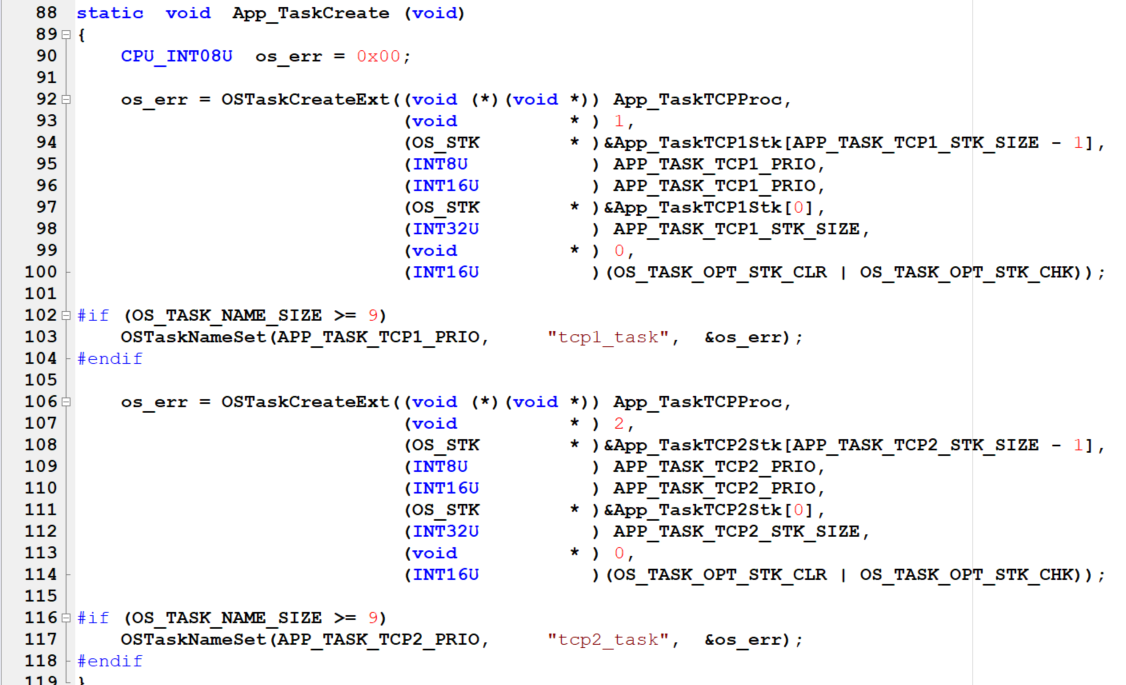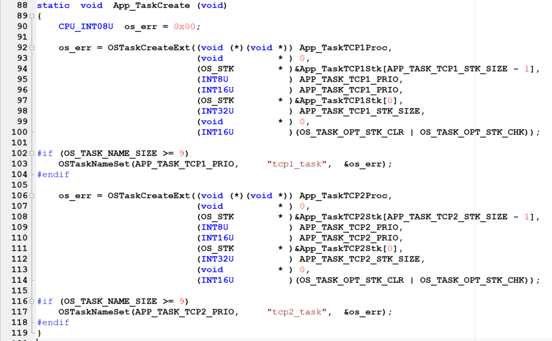 在main.c 文件中,创建两个TCP任务,名称为App_TaskTCP1Proc和App_TaskTCP2Proc。