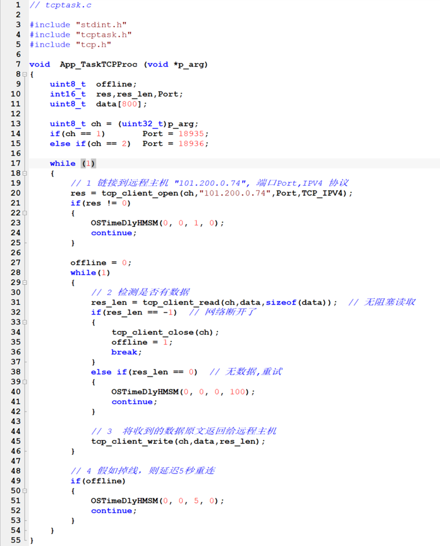 从上面的代码里,我们可以看到,两个tcp任务的代码是类似的,却用了两个函数,这个就是两个任务两份代码,后面会看到我们的一份代码实现方案。