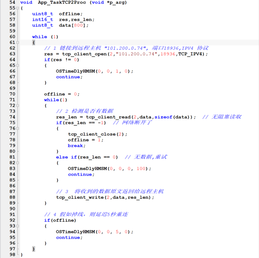 从上面代码里可以看到,我们把形式参数void *p_arg 又转成整数,从而获取到通道号1和2。这样一套代码,实现了两个链接,TCP任务1去链接"101.200.0.74"的18935端口,TCP任务2去链接18936端口。