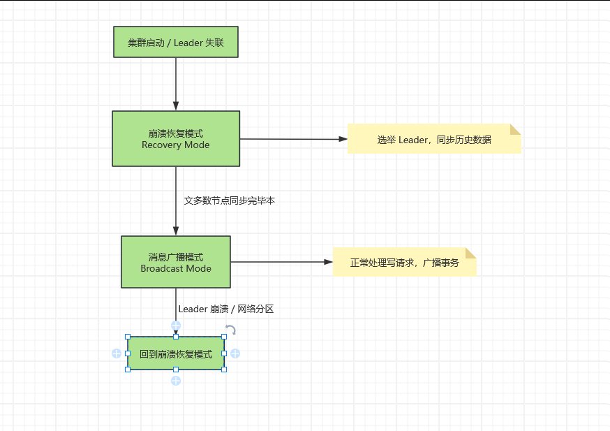 正常运行时,集群处于消息广播模式,高效处理读写请求。一旦 Leader 失联或集群启动,立即切换到崩溃恢复模式,完成新 Leader 的选举和数据同步,再重新进入广播模式。