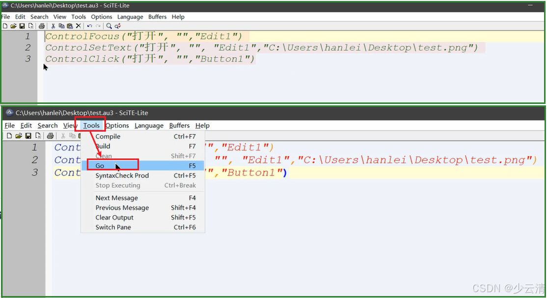 - 在SciTE Script Editor 保存脚本,并点击Tools->Go,运行。
