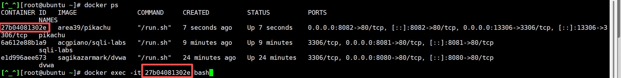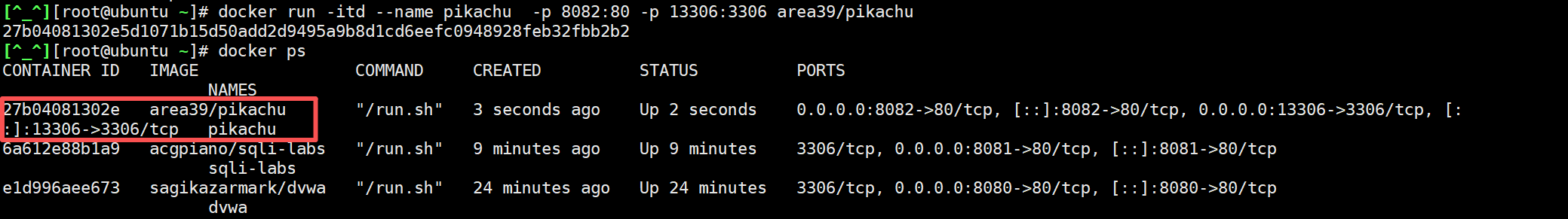docker run -itd --name pikachu -p 8082:80 -p 13306:3306 area39/pikachu