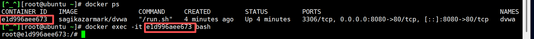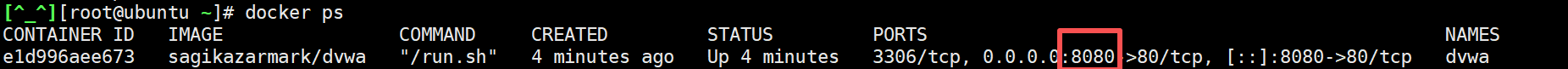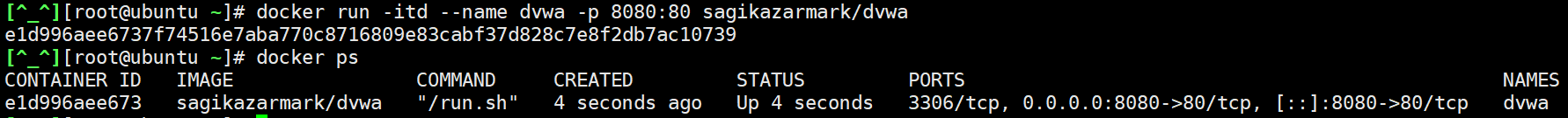 docker run -itd --name dvwa -p 8080:80 sagikazarmark/dvwa