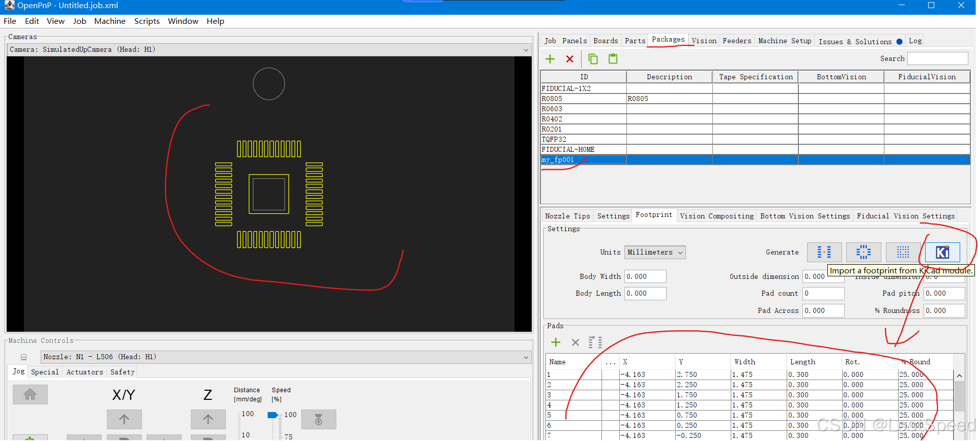 openpnp2.4中,在封装处,可以新建封装,然后自动导入kicad版本的元件封装文件(.kicad_mod). 这样就不用自己手工编辑元件焊盘数据了。