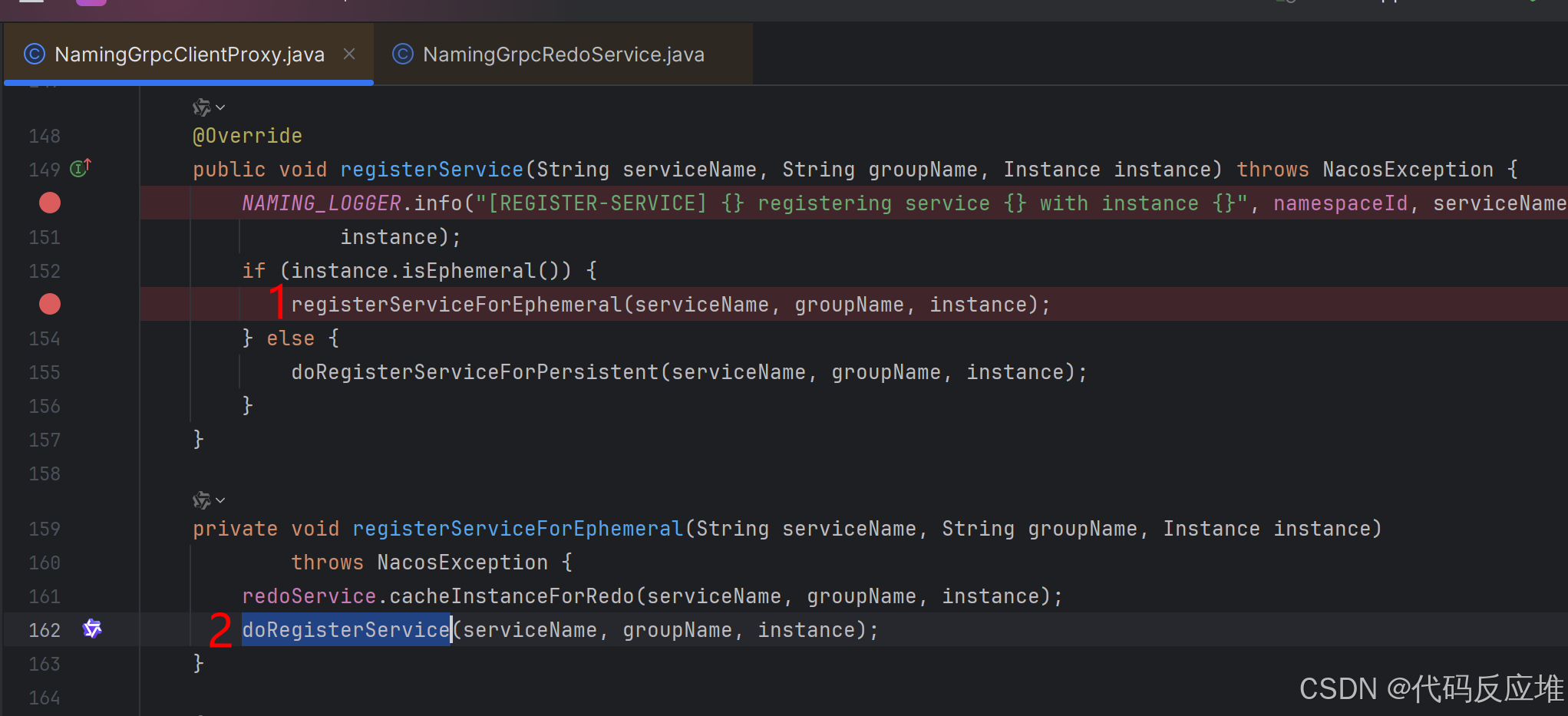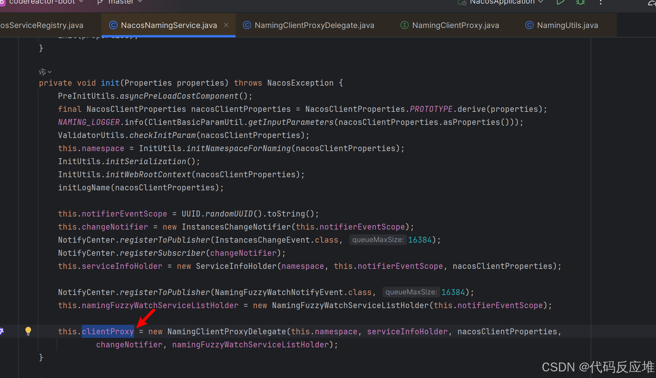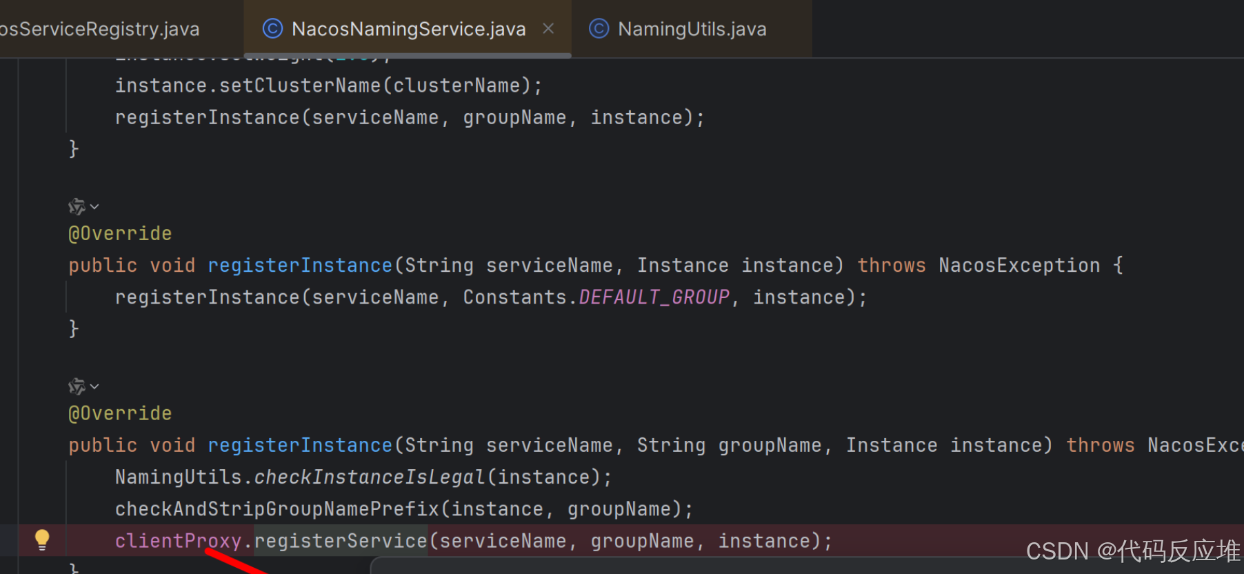 这里,我们已经从Spring配置层进入了Nacos Client SDK层,namingService是NacosNamingService的实例,它是Nacos客户端注册发现的核心实现类,调用registerInstance执行注册逻辑。