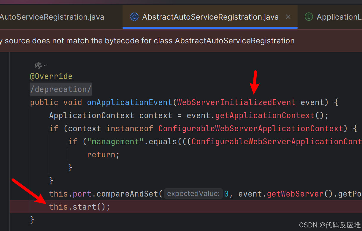 NacosAutoServiceRegistration 继承了AbstractAutoServiceRegistration类,AbstractAutoServiceRegistration类实现spring的ApplicationListener扩展接口,当web容器初始化完成触发start方法